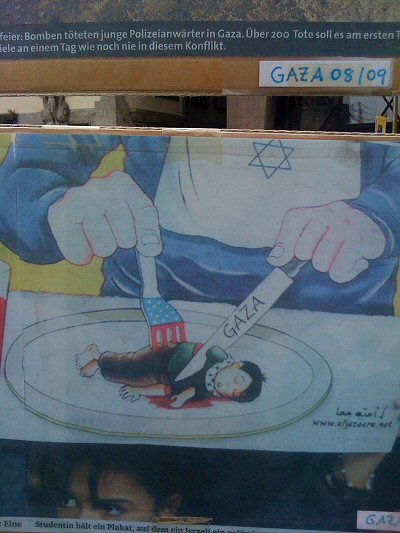 (Als ich vor sechs Jahren zu einem Vortrag nach Wien eingeladen wurde begegnete mir im Zentrum Wiens eine gleiche Antiwand, mit den gleichen abstoßenden, geifernd inszenierten antisemitischen Verlautbarungen ausgestattet. Auch hier war eine Diskussion mit deren Protagonisten nicht möglich. Wenn man sich freundlich auszudrücken bemüht darf man deren Protagonisten, die brav das Erbe ihrer nationalsozialistischen Eltern weitertragen, als überzeugte Nationalsozialisten bezeichnen. Das ideologische „linke“ Deckmäntelchen, das sie sich anzueignen bemühen, ändert daran nichts. Wir müssen an dieser Stelle nicht Adorno bemühen.)