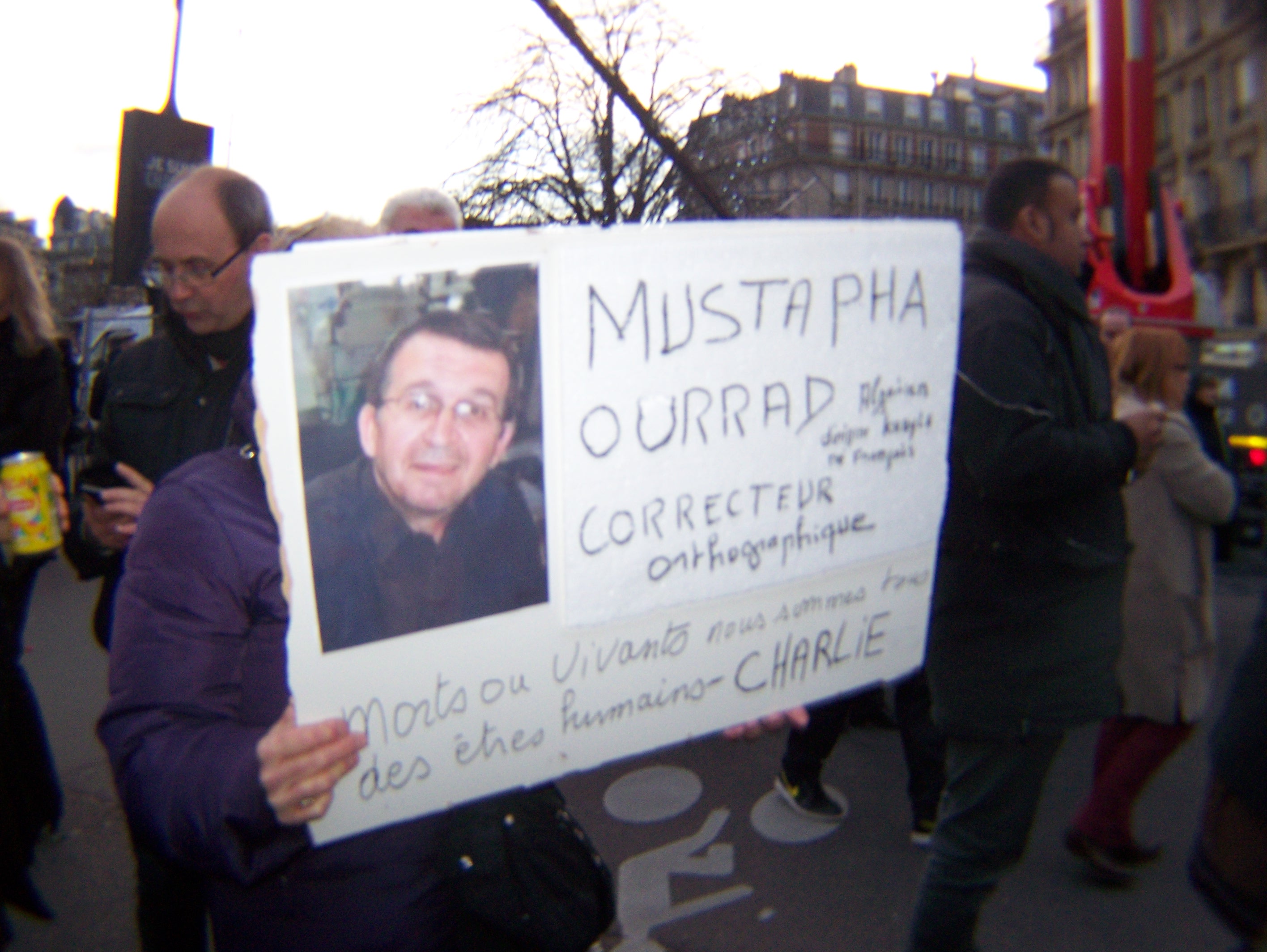Manche Schilder und Plakate beziehen auch muslimische Menschen gezielt mit ein. Eine gut 50jährige Frau etwa hält ein Transparent in die Höhe mit dem Foto und Namen von Mustapha Ourrad hoch. Er arbeitete als Korrektor bei der Redaktion von Charlie Hebdo und zählt zu den Attentatsopfern, seine Familie stammte aus der Kabylei, einer von Berbern geprägten Region in Algerien. Eine jüngere Frau hat ihrerseits ein Schild gemalt mit der Aufschrift: „Ich bin Charlie, und ich mag die Muslime!“