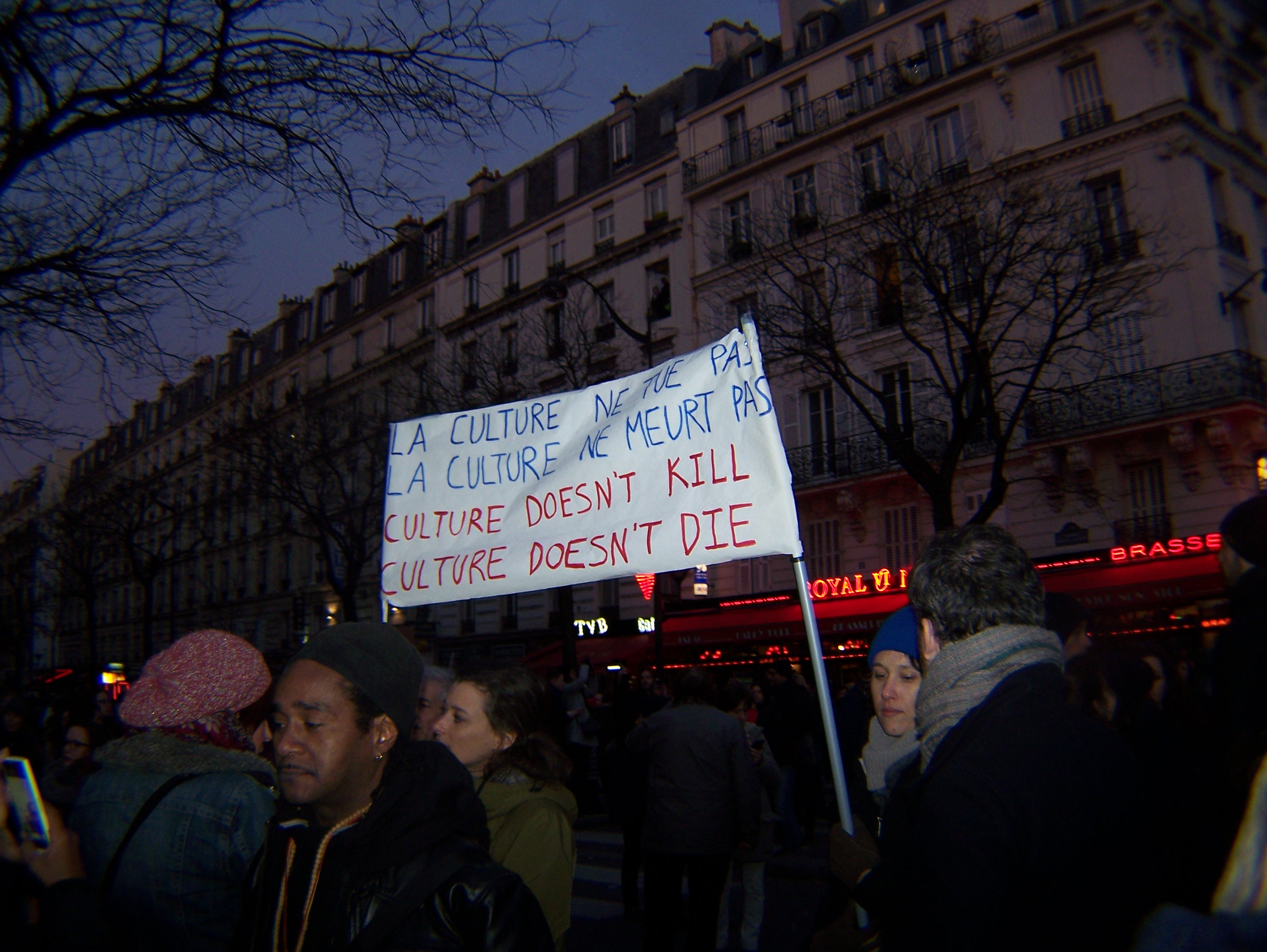 Aggressivität, etwa gegen Muslime, oder nationalistische Mobilmachung – im Sinne von „Frankreich ist angegriffen worden“, wie etwa Ex-Präsident Nicolas Sarkozy verkündet hatte – ist nicht die vorherrschende Grundstimmung der Menge an diesem SOnntag. Zwar werden auch einige französische Flaggen mitgeführt, aber auch Menschen mit Migrationshintergrund haben ihre eigenen Fahnen mitgebracht. Die häufigsten sind die portugiesische und die brasilianische. Der Autor sah auch eine einzelne deutsche und eine einzelne albanische Fahne. Eher verirrt wirkt das Schild einer jungen Frau, das proklamiert: „Stolz, Französin zu sein.“