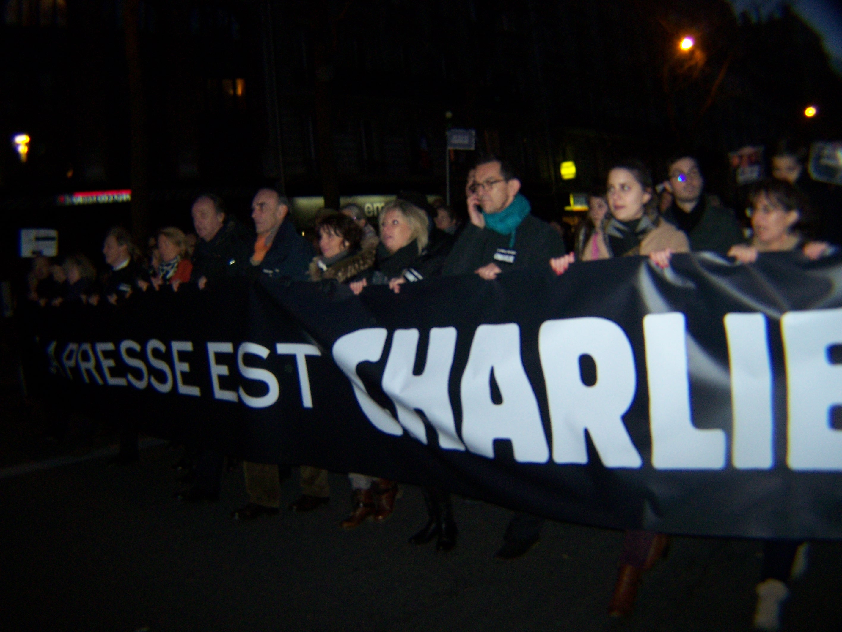 Einige Demonstranten und Demonstrantinnen sind ferner durch äußere Erkennungsmerkmale als Menschen muslimischen Glaubens zu erkennen, wenngleich diese Gruppe zahlenmäßig schwächer vertreten ist, als es ihrem Anteil an der Gesamtbevölkerung entspricht. Eine Frau mit orangefarbenem Kopftuch wird immer wieder von Mitmarschierenden gebeten, sich mit ihr fotografieren zu lassen. Sie hat auf ihr Schild gemalt: „Wer einen Menschen tötet, bringt die Menschheit um. Ein Menschenleben ist überall gleich viel wert – ob in Paris, Nigeria, Syrien oder in Gaza.“ Und einer der meistapplaudierten Blöcke in der Demonstration  – nach dem der Opferfamilien und der verbliebenen Charlie-Redaktion, und wohl auch den Polizisten – ist der von syrischen Oppositionellen, die iherseits „Ana Schahrly“ auf ihre Schilder geschrieben haben. Und die immer wieder ausrufen: „Ich bin Charlie, ich bin Syrer. Assad – Mörder, Jihadisten – Mörder.“ Sie loben die syrischen Oppositionellen, aber auch den militärischen Widerstand in der kurdischen Stadt Kobanê gegen den selbst ernannten „Kalifatsstaat“ des IS.