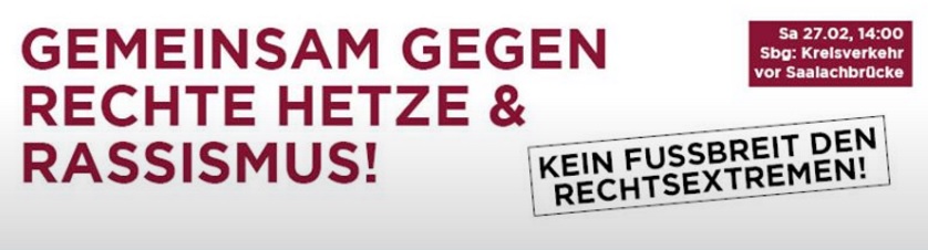 Am Samstag, 27. Februar, marschieren Rechtsextreme in Freilassing und Salzburg auf, um ihre rassistische und menschenfeindliche Propaganda zu verbreiten. Wir, ein breites Bündnis von Vereinen, Gruppen, Verbänden und Parteien aus Salzburg und dem Berchtesgadener Land, stellen uns auch dieses Mal den rechten Hetzern entgegen. Rassismus und Menschenverachtung haben bei uns keinen Platz! …