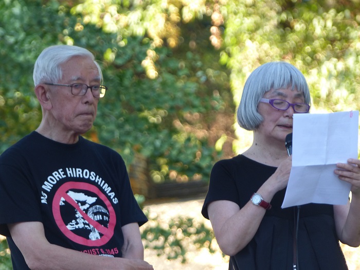 Selbst im Hiroshima-Nagasaki Park ist es heiß, als man sich am 6.8. ab 19 Uhr trifft. Wohl 60 Leute sind gekommen, überwiegend ältere Menschen, einige japanische Frauen, einige auch mit Rollstuhl. „Früher waren es viel mehr“, erzählt mir Angelika. Es sind auffallend viele Frauen da, eine trägt ein völkisches, friedliebendes palästinensisches Kopftuch. Schweigen wir lieber…