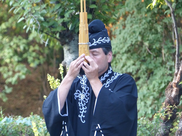 Es folgen Lieder, intoniert von Blue Flower, musikalisch durchaus gelungen. Einige singen mit, Liedertexte werden verteilt. Ein japanischer Musiker, Yoshiro Shimizu, spielt auf einem traditionellen japanischen Instrument. Parallel dazu wird entsprechend einer buddhistischen Tradition von vielen Teilnehmern der Getöteten erinnert: Nacheinander tritt man einzeln an den Gedenkstein heran und streicht Wasser mit einem Blatt auf den städtischen Gedenkstein.