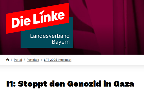 [1] https://www.die-linke-bayern.de/partei/parteitag/lpt-2025-ingolstadt/detail/i1-stoppt-den-genozid-in-gaza/ (letzter Zugriff am 29.09.2025).