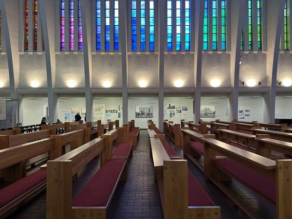 (7) Für zahlreiche Außen- und Innenaufnahmen siehe https://commons.wikimedia.org/wiki/Category:Kirche_am_Hohenzollernplatz_(Berlin)?uselang=de (25.08.2025). Dort steht noch, die Kirche sei „1931 bis 1933 nach Plänen von Fritz Höger erbaut“ worden.