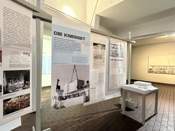 Daneben bilden fünf kurze Dokumentarfilme Auseinandersetzungen von Studierenden der Tel Aviver Universität ab: (1) mit Klarweins Planungen für Nahariya in den 1940er- und 1960er-Jahren, (2) mit Beit HaKranot, einem 1937 eingeweihten Geschäfts- und Bürogebäude in Haifas Stadtviertel Hadar HaCarmel, (3) mit den bereits genannten Dagon-Silos, (4) mit dem Nationalfriedhof auf dem Mount Herzl in Jerusalem (ein Ort, für dessen Gestaltung Klarwein einen Wettbewerb gewann, ohne den Entwurf umsetzen zu können) und – natürlich – (5) mit den Planungen für die Knesset.(9) Darüber hinaus ergänzen ein Film zur baulichen Entwicklung der Kirche Am Hohenzollernplatz und ihrer Umgebung sowie eine Installation mit einigen Informationen zu ihrer Architektur und Geschichte auf dem Vorplatz die Ausstellung und den Ort selbst.