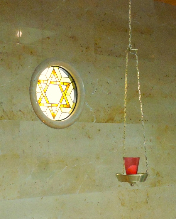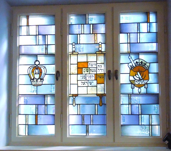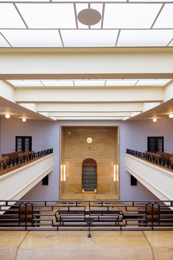 Auch die farbigen Glasfenster mit ihren Ornamenten wurden nach den Originalvorlagen wieder hergestellt, ebenso die Glasdecke, die Marmorverkleidung in der Ost-Nische um den Thoraschrein, und darüber das Ner Tamid, das ewige Licht