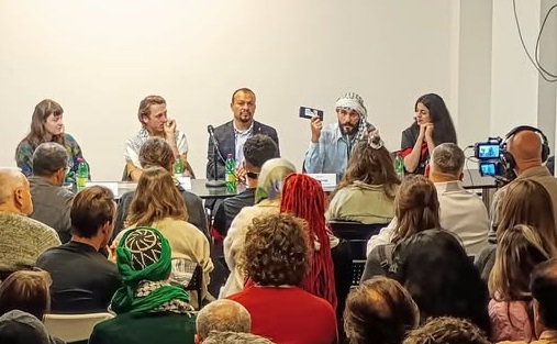 Das Setting: Die Palästina Solidarität Österreich hatte zu einer öffentlichen Veranstaltung eingeladen. “Global Sumud Aktivisten erzählen”. Es geht um die Reise der Gaza-Flottila und die kurze Zeit im israelischen Gefängnis. Ich bin gekommen, um zu bleiben. Reporterblut eben. Sitze ganz hinten am Kindersofa. Man isst Pizza mit Zwiebel und Oliven. Links neben mir sitzt eine sehr attraktive junge Irakerin (?) mit ihrer Schwester. Niemand beachtet mich und das ist gut. Ich habe vor zu bleiben, bis die Polizei mich raus bittet. Doch dazu kommt es nicht.