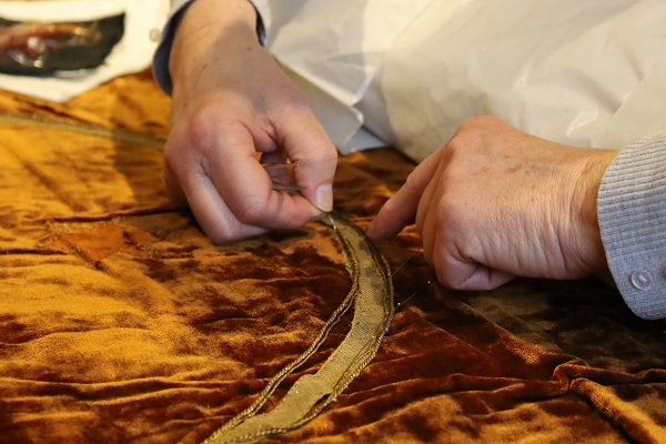2025 wurden konservatorische Maßnahmen zur Sicherung des empfindlichen Materials durchgeführt. Der aus braun-rotem Seidensamt und gelbem Seidendamast gefertigte Vorhang zeigte altersbedingte Schäden, insbesondere an den Metallgarnstickereien und Fransen. In sorgfältiger Handarbeit wurden die losen Kordeln und Borten wieder angenäht, um das Textil für die Zukunft zu erhalten.