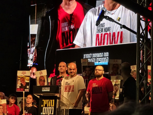 Eitan Horn, der erst vor wenigen Wochen nach 738 Tagen freigelassen wurde, sprach erstmals öffentlich, gemeinsam mit seinem Bruder Iair Horn, der im Februar freigelassen worden war. Sie kamen zusammen mit ihrem Bruder Amos Horn, der sich unermüdlich für ihre Rückkehr eingesetzt hatte.