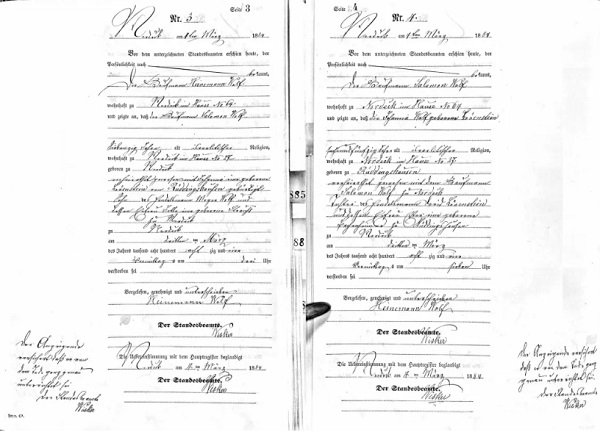 Stefan Gotthelf Hoffmann hat den „Nordecker Judenmord“, wie er damals in der Presse genannt wurde, in einem zweibändigen Werk minutiös nachrecherchiert.[1] Die Arbeit ist indes viel mehr als „Ein Beitrag zur Familiengeschichte des Schriftstellers Friedrich Wolf“, wie es im Untertitel heißt – ein dicht gewebtes „Psychogramm“ des ländlichen deutschen Judentums, seiner psychosozialen, gesellschaftlichen, sozioökonomischen Bedingtheiten, Konflikte und Beziehungen mit der Mehrheitsgesellschaft. Im ersten Band geht es um die Tat selbst, den Prozess und die Rezeption des Falls (bis dahin, dass sich die Fama vom „Wucherer“ Salomon Wolf, der einen wohlhabenden Bauern, sein „Opfer“, in den Ruin getrieben habe bis in die jüngere Gegenwart sogar in wissenschaftlichen Aufsätzen gehalten hat). Der zweite Band befasst sich detailliert mit den Folgen der grausamen Tat und steht damit als Solitär in der Friedrich-Wolf-Forschung da. Niemand zuvor hat sich explizit Gedanken darüber gemacht, dass und welchen Einfluss die Bluttat auf die Familie, namentlich Max Wolf und seine Nachkommen hatte, oder wenn doch, ihn abgestritten. Doch weder Max Wolf noch sein Sohn wurden aus dem Nichts wie sie wurden …