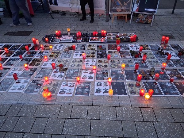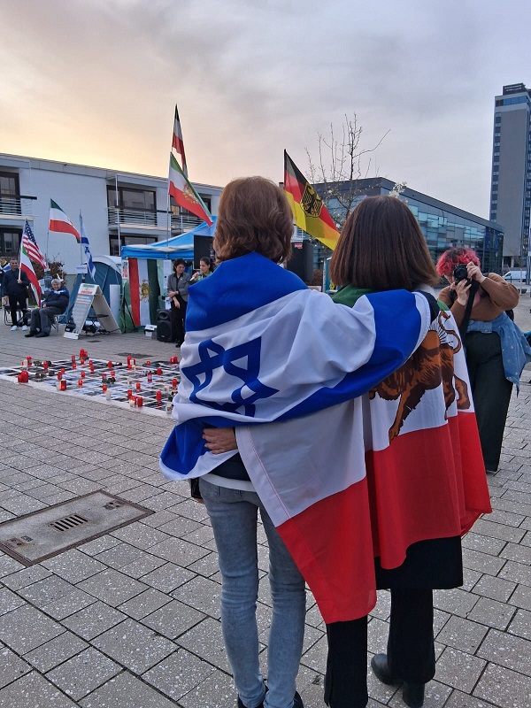 Applaus unterstützt seinen Dank. Menschen, die iranische, israelische, deutsche und amerikanische Fahnen halten, blicken auf Fotos zahlreicher Menschen, die in den Protesten gegen das Mullah-Regime getötet wurden. Symbolisch liegen diese auf dem Platz der Vereinten Nationen, von Blumen und Kerzen gerahmt. „Wir danken und wir gedenken derjenigen, die ihr Leben verloren haben im Kampf gegen das islamistische Regime, das unser Land seit Jahrzehnten besetzt hält.“ Manchen Anwesenden treten Tränen in die Augen, währen die iranische Nationalhymne und die Hatikvah gespielt werden.