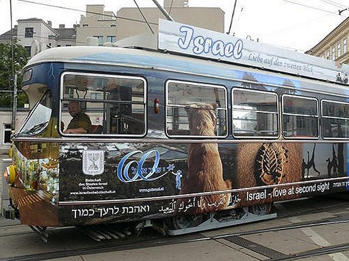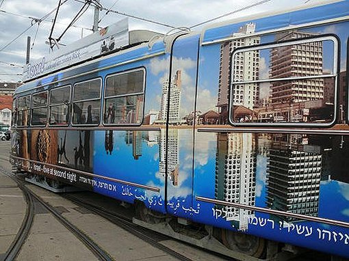 Straßenbahn, die mit Bildern von Israel bedruckt ist und zweimal pro Woche