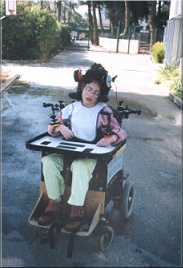 Wie man hoffentlich auch auf dem Photo erkennt, sitzt sie immer im Rollstuhl und ist für alles auf Hilfe angewiesen. Mit ihr gehe ich spazieren, daß heißt sie fährt einen elektrischen Rollstuhl und ich gehe nebenher und passe auf, daß nichts passiert, keine Blumentöpfe umgeworfen oder andere Kinder angefahren werden.